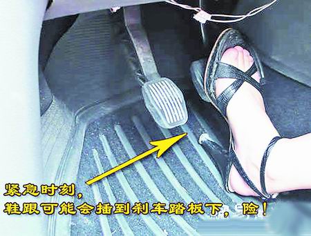 ????高跟鞋、厚底鞋和拖鞋都是夏日女性的最愛。但是這些非常不利于駕駛。穿著高跟鞋、厚底鞋,或者是拖鞋,甚至還有很多美女喜歡赤腳開車。在出現緊急狀況下,這些都是自己給自己埋下的地雷。薄底、柔軟的休閑鞋(鞋底不出邊)才是女性駕車時的最安全選擇。如果有必要換鞋的時候,也切記換下的鞋不能放在前座下或前座旁(避免滾至制動踏板下)。