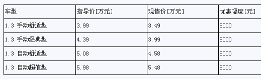 ????目前,北京銷售的現(xiàn)款奔奔均為1.3L車型,1.0L車型一直沒有進(jìn)京銷售.1.3L手動擋有經(jīng)典型和舒適型有現(xiàn)貨,指導(dǎo)價分別為3.99和4.39萬元,自動擋有5.08萬元和5.98萬元兩款,這四款車型均可優(yōu)惠5000元,顏色方面,目前除紅色之外,其余顏色,藍(lán)色,白色。銀色,金色等車型均由現(xiàn)貨。。