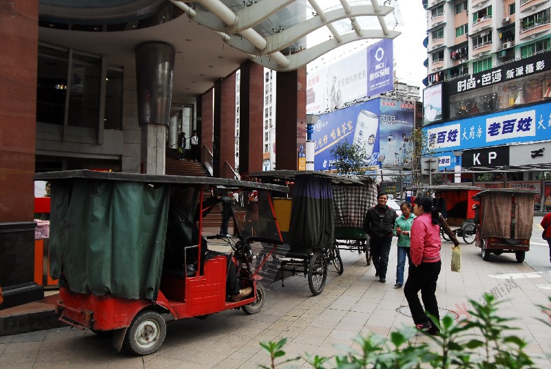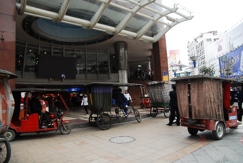 1月6日,一排三輪車停在市區恒業國泰商場門前。攝影 李鴻榮