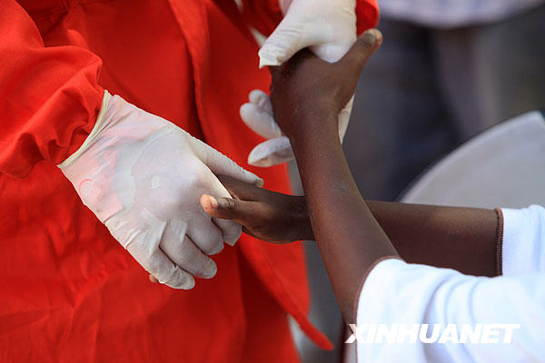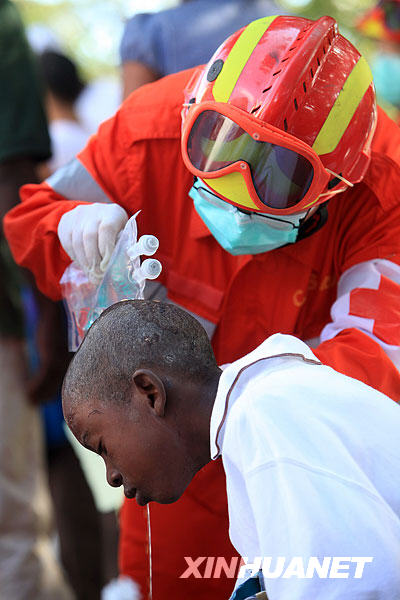 ????1月14日,中國國際救援隊的醫(yī)務(wù)人員在海地首都太子港為傷員進行治療。當日,中國國際救援隊的醫(yī)護人員來到海地總理府前的廣場,為在這里避難的群眾進行診療,開展醫(yī)療救助。加勒比島國海地當?shù)貢r間12日下午發(fā)生里氏7.3級強烈地震,首都太子港大量房屋倒塌,交通通訊中斷,人員傷亡情況至今難以統(tǒng)計,海地領(lǐng)導(dǎo)人估計死亡人數(shù)可能超過數(shù)萬人。新華社記者邢廣利攝