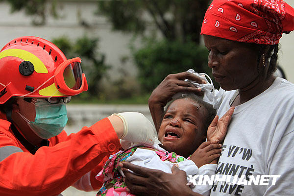 ????1月14日,在海地首都太子港,中國國際救援隊的醫(yī)務(wù)人員拉著一位小朋友的手,安慰他很快就會不痛了。當日,中國國際救援隊的醫(yī)護人員來到海地總理府前的廣場,為在這里避難的群眾進行診療,開展醫(yī)療救助。加勒比島國海地當?shù)貢r間12日下午發(fā)生里氏7.3級強烈地震,首都太子港大量房屋倒塌,交通通訊中斷,人員傷亡情況至今難以統(tǒng)計,海地領(lǐng)導(dǎo)人估計死亡人數(shù)可能超過數(shù)萬人。新華社記者邢廣利攝