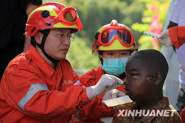 ????1月14日,中國國際救援隊的醫(yī)務(wù)人員在海地首都太子港為傷員進行治療。當日,中國國際救援隊的醫(yī)護人員來到海地總理府前的廣場,為在這里避難的群眾進行診療,開展醫(yī)療救助。加勒比島國海地當?shù)貢r間12日下午發(fā)生里氏7.3級強烈地震,首都太子港大量房屋倒塌,交通通訊中斷,人員傷亡情況至今難以統(tǒng)計,海地領(lǐng)導(dǎo)人估計死亡人數(shù)可能超過數(shù)萬人。新華社記者邢廣利攝 |