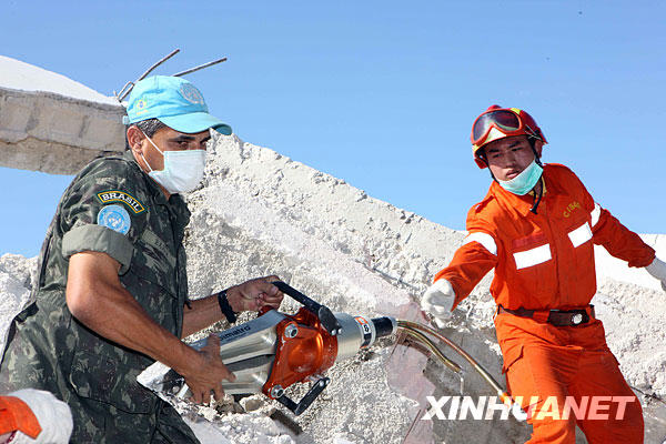 1月14日,在海地首都太子港,一名巴西駐海地維和工程兵(左)向一名中國國際救援隊員傳遞救援工具。