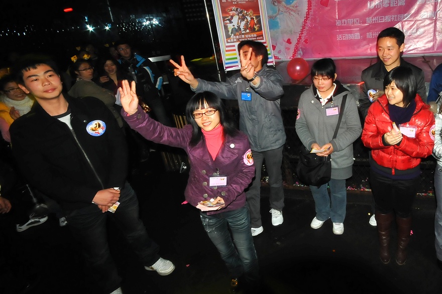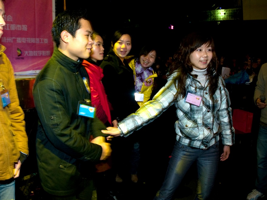 幾輪游戲下來,大家僅存的一點陌生感也消失殆盡了。通過在游戲中的配合,這些年輕男女都有了各自“鐘情”的對象,有的直接在“愛情密碼”環節中大膽寫出了自己喜歡女孩的號碼,并利用臺上游戲的間隙,低聲地交流起來。
