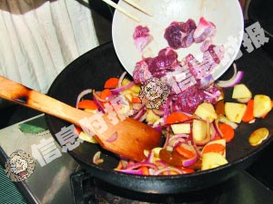 4、加入牛腩,待牛腩翻炒至變色時,并加2杯清水燜煮。