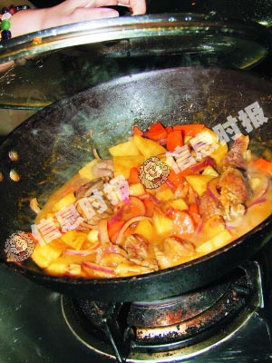 5、待牛腩燜煮至軟爛時,放入咖喱膏,轉小火翻炒十數秒,再加適量清水熬煮。