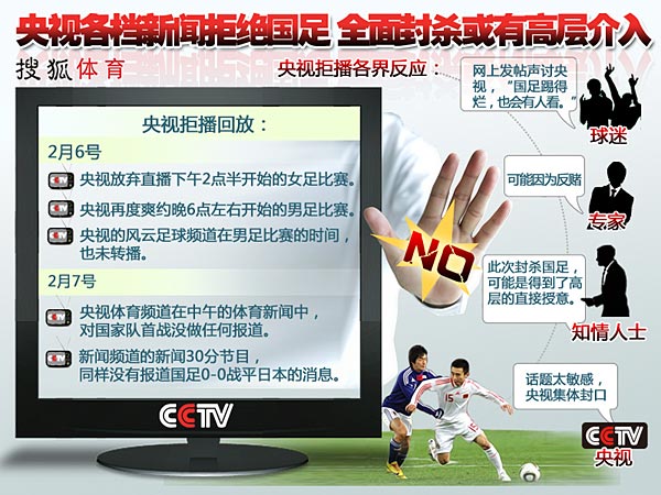 ??? 央視封殺國足?2月6日晚,當許多球迷打開電視機,準備觀看東亞四強賽中日男足比賽時,卻突然發現,央視五套取消了原定的直播計劃,改播《城市之間》,央視風云足球頻道則錄播了本賽季德甲聯賽的集錦。不僅如此,昨天的體育新聞對國足也是只字不提。
