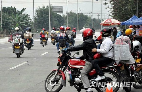 2月3日,一批騎摩托車返鄉(xiāng)過年的廣西農(nóng)民工在廣東封開縣長崗收費站休息后繼續(xù)踏上返鄉(xiāng)行程。封開縣是321國道從廣東進入廣西的第一站,是廣西籍農(nóng)民工駕摩托車返鄉(xiāng)的必經(jīng)之路。截止到2月3日上午10時,春運以來通過該縣境內(nèi)的返鄉(xiāng)摩托車已超過3.5萬輛(次)。新華社發(fā)(韋石明 攝)