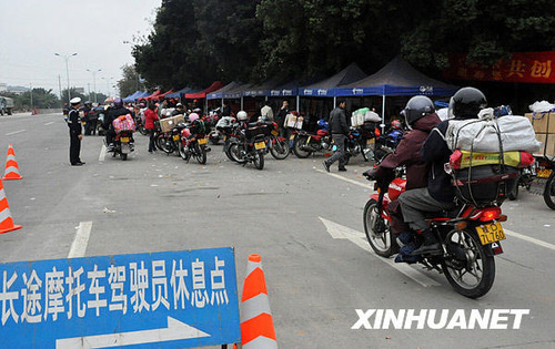 ????2月3日,一批騎摩托車返鄉(xiāng)過年的廣西農(nóng)民工在廣東封開縣長崗收費站休息后繼續(xù)踏上返鄉(xiāng)行程。封開縣是321國道從廣東進入廣西的第一站,是廣西籍農(nóng)民工駕摩托車返鄉(xiāng)的必經(jīng)之路。截止到2月3日上午10時,春運以來通過該縣境內(nèi)的返鄉(xiāng)摩托車已超過3.5萬輛(次)。新華社發(fā)(韋石明 攝)