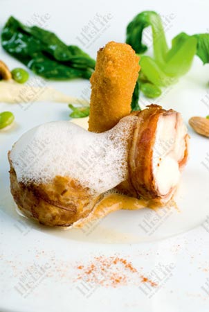 ????鮮嫩的扁沙魚(yú)先經(jīng)過(guò)8小時(shí)的腌漬,再用肥瘦均勻的豬腹肉薄片包裹起來(lái)煎烤,豬肉的油脂補(bǔ)足了魚(yú)肉缺少的滑潤(rùn)。配菜不拘一格地采用青翠的四季豆、鮮嫩的油菜心和毛豆中西合璧,味道的搭配天衣無(wú)縫。相對(duì)于主料的簡(jiǎn)約,醬汁的豐富有點(diǎn)奢華了,濃香的葵花油醬、辛香的蒜蓉醬、清香的白菜花醬、奶香的西班牙香腸,給主料新嫩清香的質(zhì)感增加了一連串豐富的層次。