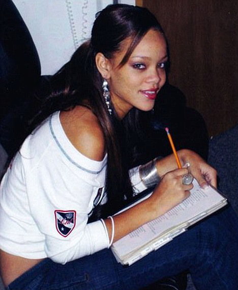 那時候的蕾哈娜清純溫婉,在唱片公司本部里手握鉛筆勤力寫歌。
