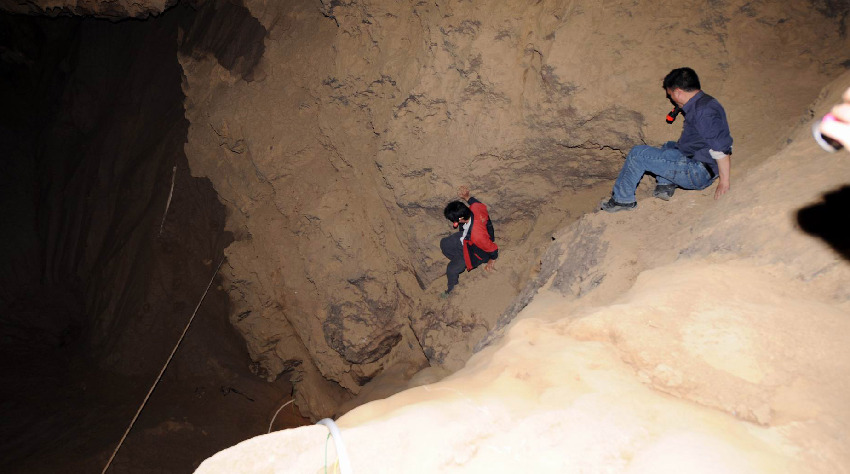 3月31日,南丹縣八圩瑤族鄉(xiāng)村民在一百多米深的山洞里查看水源。