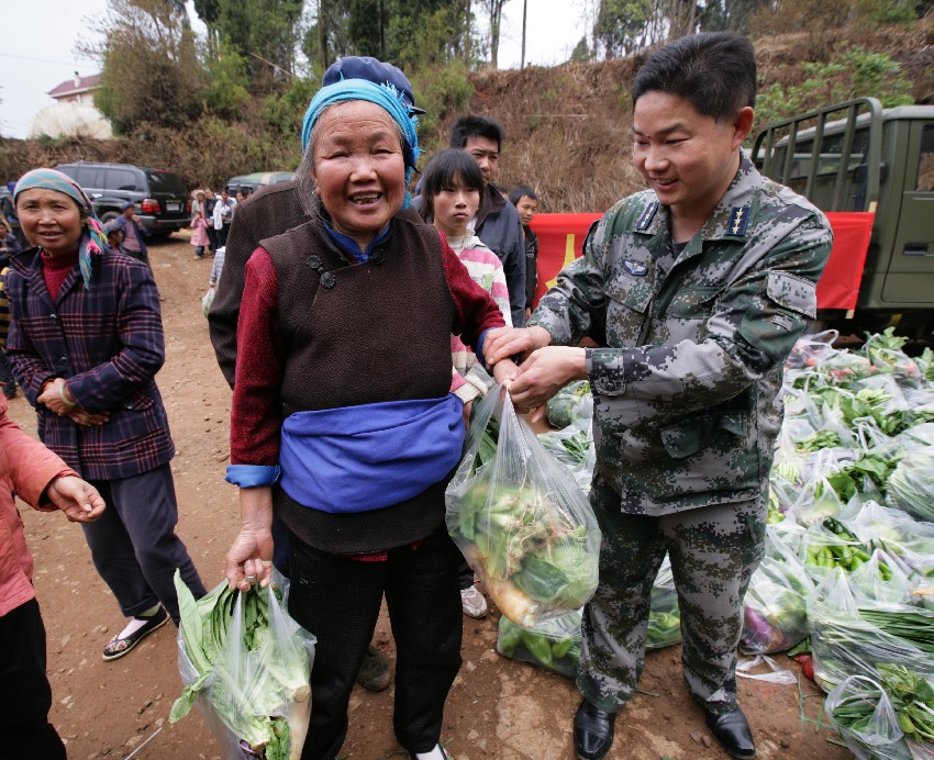 3月28日,空軍駐云南某部官兵為災區群眾分發蔬菜。