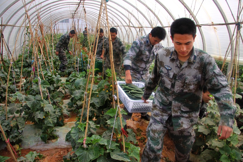 3月28日,空軍駐云南某部官兵在部隊(duì)菜園摘菜,準(zhǔn)備送往災(zāi)區(qū)。