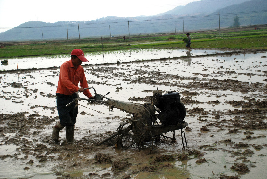 不少農(nóng)戶從小河抽水澆灌后忙碌地進(jìn)行春耕、春插。記者 蒙紹松/攝