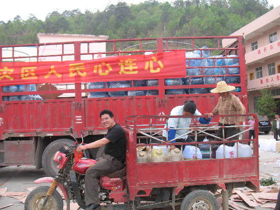 3月30日,百色災區群眾領到梧州的愛心泉水,高興地笑了。