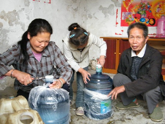 3月31日上午,送水車到達河池市金城江區九圩鎮梅洞村,向當地群眾送上了甘甜的桶裝礦泉水。圖為村民和梅洞小學的學生們興高彩烈搬水的情景。記者 賴新云 攝