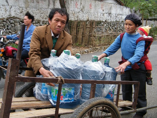 3月31日上午,送水車到達河池市金城江區九圩鎮梅洞村,向當地群眾送上了甘甜的桶裝礦泉水。圖為村民和梅洞小學的學生們興高彩烈搬水的情景。者 賴新云 攝
