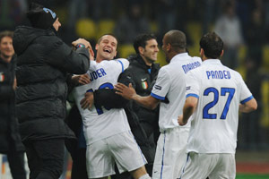 ????新浪體育訊 北京時間4月7日0時30分(俄羅斯當地時間6日20時30分),歐洲冠軍杯1/4決賽次回合開始首場角逐,國際米蘭客場1比0擊敗莫斯科中央陸軍,追平歐戰5連勝的俱樂部紀錄,以總比分2比0晉級,7年來首次打進歐冠半決賽,穆里尼奧成為首位帶領3支不同球隊打進冠軍杯4強的主教練。開場僅6分鐘,斯內德任意球破門。下半時開始不久,中央陸軍替補后衛奧迪亞累計2張黃牌被罰下,此后門將阿金費耶夫高接低擋,力阻國米擴大比分。