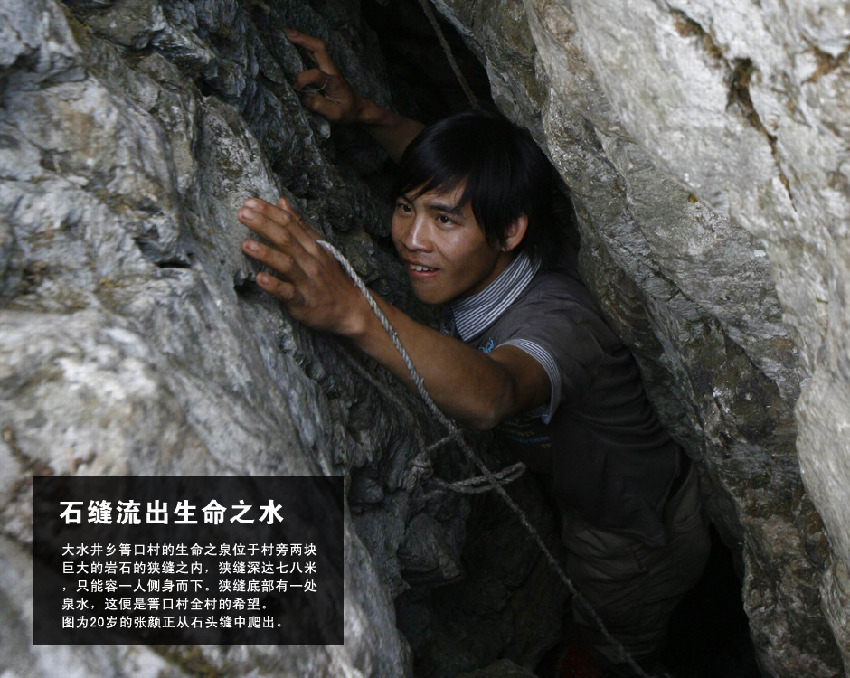大水井鄉箐口村的生命之泉位于村旁兩塊巨大的巖石的狹縫之內,狹縫深達七八米,只能容一人側身而下。狹縫底部有一處泉水,這便是箐口村全村的希望。今年2月,箐口村周圍的山泉開始干涸。村里開始發動過年回家的60余名年輕人,在亂石林立的山中,到處尋覓。2月底,村民終于發現了這處藏在巨石間的泉水。由于狹縫較深,每次取水都需兩個村民一起才能完成:村民先將一根十余米長的粗繩甩入洞中,一個村民在洞口拽住繩子,另一個村民沿繩下爬。因為這種特殊的取水方式,當地村民將這眼“石中泉”稱為“吊井”。