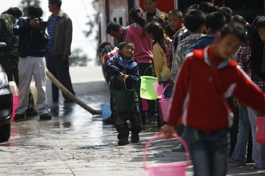 大水井鄉中心完小校的學生正在提水。