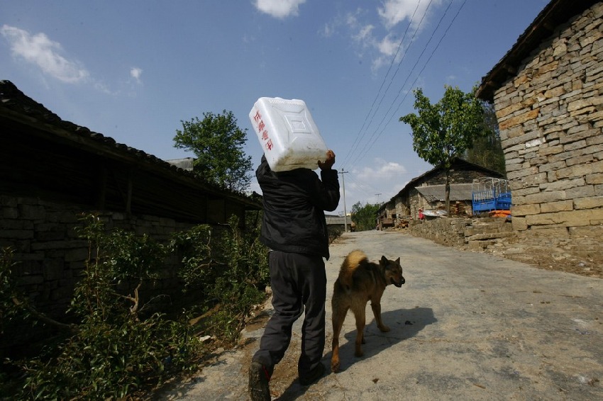 云南省羅平縣大水井鄉(xiāng)唐梨凹村,村民背著水回家。