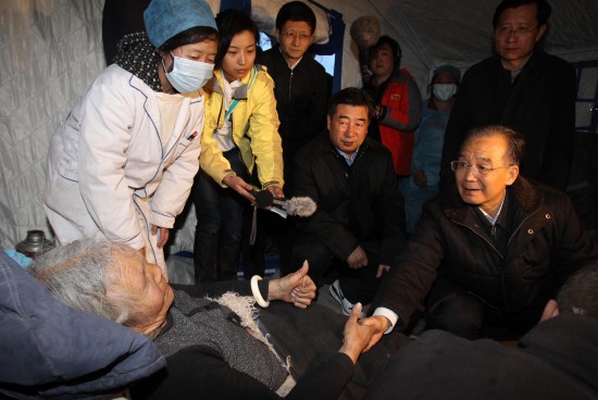 晚上8點(diǎn)40分,溫家寶在國(guó)務(wù)院抗震救災(zāi)總指揮部的臨時(shí)帳篷里主持召開會(huì)議,聽取玉樹抗震救災(zāi)情況的匯報(bào)并作了重要指示。會(huì)議結(jié)束時(shí)已經(jīng)過(guò)了23時(shí),溫家寶又步行道體育場(chǎng)群眾安置點(diǎn)看望群眾。