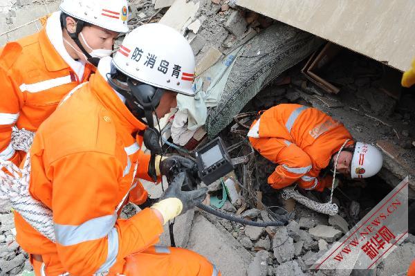 4月16日,來自山東青島的救援隊員在結古鎮紅衛路民族賓館利用可視生命探測儀進行搜救。新華社記者 李紫恒 攝