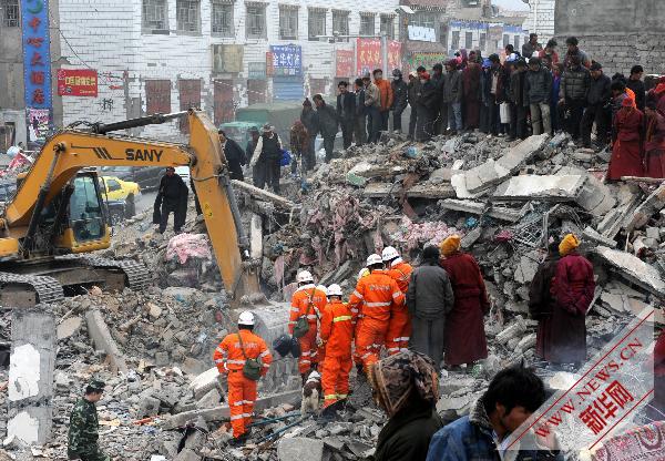 4月16日,來自山東的救援隊員在結古鎮紅衛路民族賓館進行搜救。新華社記者 李紫恒 攝