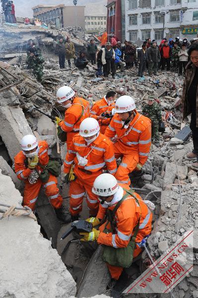 4月16日,來自山東的救援隊員在結古鎮紅衛路民族賓館進行搜救。新華社記者 李紫恒 攝