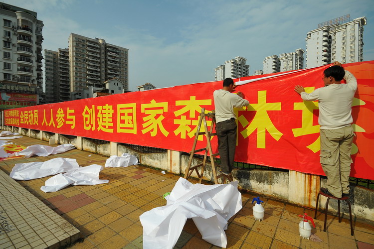 ?4月27日,工作人員張貼創森大幅標語。當日,一幅標有“西江河畔綠明珠 生態宜居森林城 全民動員 人人參與 創建國家森林城市”的紅色大幅標語出現在奧奇麗路與西堤路交匯處,標語內容顯示了市委市政府對梧州創建國家森林城市的決心。 何鎏/攝