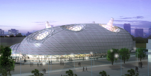 ????這是一座“會呼吸的展館”,“凹槽”和“觸角”喻意生命體的“嘴、耳朵、鼻孔”和“手指”。半圓形的大穹頂呈淡紫色,像一個巨大的蠶繭,故名“紫蠶島”。日本館是上海世博會各國家館之中面積最大的展館之一,同時也是日本參展世博會史上規模史無前例的展館。展館高約24米,外部呈銀白色,采用含太陽能發電裝置的超輕“膜結構”包裹,形成一個半圓型的大穹頂,宛如一座“太空堡壘”。