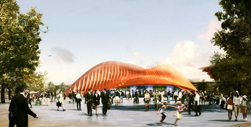????遠(yuǎn)觀,猶如烈焰紅唇;近看,仿佛是流動(dòng)的沙丘;用手去觸碰,發(fā)現(xiàn)原來是“魔術(shù)戲法”:建筑表面的玫瑰金色不銹鋼板材呈現(xiàn)出的富于變幻的色彩,角度、色澤不同,形成流動(dòng)沙丘的光感。整個(gè)阿聯(lián)酋館由三座高達(dá)20米、連綿交織、大小不同的“沙丘”組成,分別代表古代、現(xiàn)代和未來。為體現(xiàn)逼真的效果,阿聯(lián)酋館的外部呈現(xiàn)出沙丘特征:在向風(fēng)的一面,呈“沙丘”弧形的不銹鋼板在陽光下金光閃閃,變換出沙漠特有的玫紅色和熱浪,呈現(xiàn)出天然沙丘的瑰麗;同時(shí),它又將上海的風(fēng)偏轉(zhuǎn),保護(hù)光滑且半透明的背風(fēng)面,使其免受強(qiáng)風(fēng)和烈日的傷害。這種特殊的結(jié)構(gòu)使整座建筑產(chǎn)生一種流動(dòng)的感覺,每當(dāng)微風(fēng)吹過,觀眾似乎能感覺到“沙丘”在移動(dòng)。