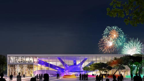 ????比利時館溫和、冷靜的建筑外觀與新奇、迷人的內部裝修構成對比。展館主體采用“腦細胞”的結構,“腦細胞”神經元的靈感來自于比利時豐富的科學和藝術成就,以及作為歐洲政治中心之一的地位。展館正面外墻將采用透明玻璃材料,另外三面外墻將采用封閉式金屬板外墻。展館共有兩個入口,一個是比利時展區的入口,一個是歐盟展區的入口。