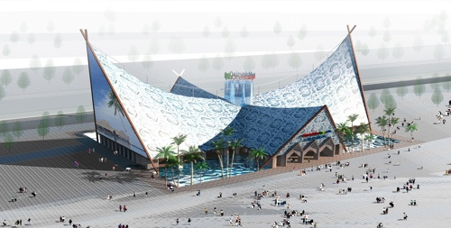 ????馬來西亞館將采用可循環利用的油棕、塑膠等材料建筑而成,重點展現馬來西亞的獨特風情和團結的民族精神。展館的設計靈感源自馬來西亞傳統建筑。整個展館由兩個高高翹起的坡狀屋頂組成,猶如一艘遠航而來的“木船”;屋頂尖端的交叉構架是馬來西亞本土建筑的特有符號;觀光電梯被設計成吉隆坡“雙塔”摩天樓形狀。參觀者不僅可以領略馬來西亞檳城、馬六甲等世界文化遺產的魅力,體驗普通馬來西亞家庭的樂生活,還能欣賞到特色藝術品及其制作過程。