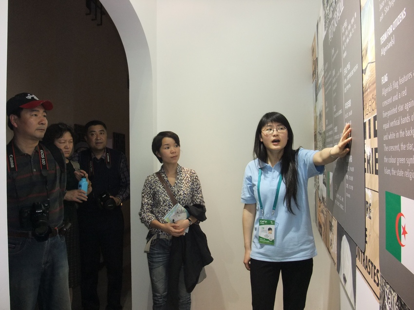 在阿爾及利亞館,記者傾聽講解員介紹該國的有關知識。