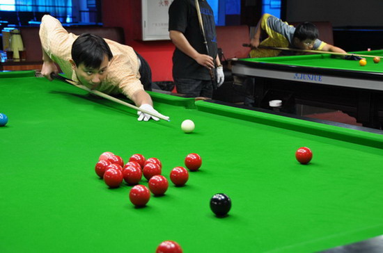萬秀區政府隊劉國輝在5月4日的斯諾克團體賽中聚精會神進行比賽,可惜萬秀區隊1:2輸給了瘋狂臺球QQ群。