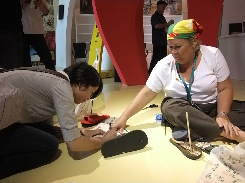 記者在加拿大館的產(chǎn)品展示區(qū),參觀加拿大人現(xiàn)場制作的工藝品。在加勒比海共同體聯(lián)合館的格林納達(dá)展館,記者代表西江都市報全體同仁,留下對上海世博會的祝福。