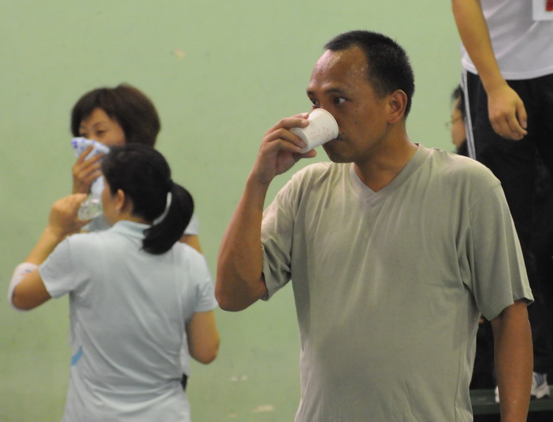 隊員們利用比賽間隙喝水補充體能。近排氣溫高,比賽強度大,對隊員體能是一個嚴峻的考驗。 韋世寧 攝