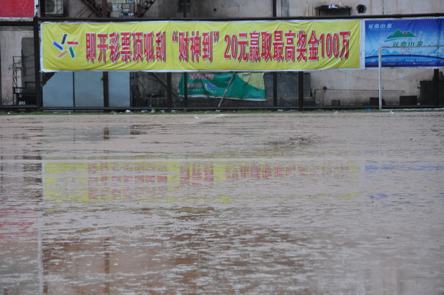 醞釀已久的暴雨讓球場成為一片澤國 黃能 攝