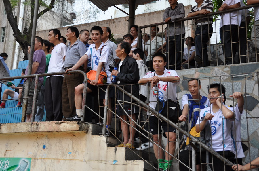 球迷朋友們興致勃勃地觀看足球雨戰 黃能 攝