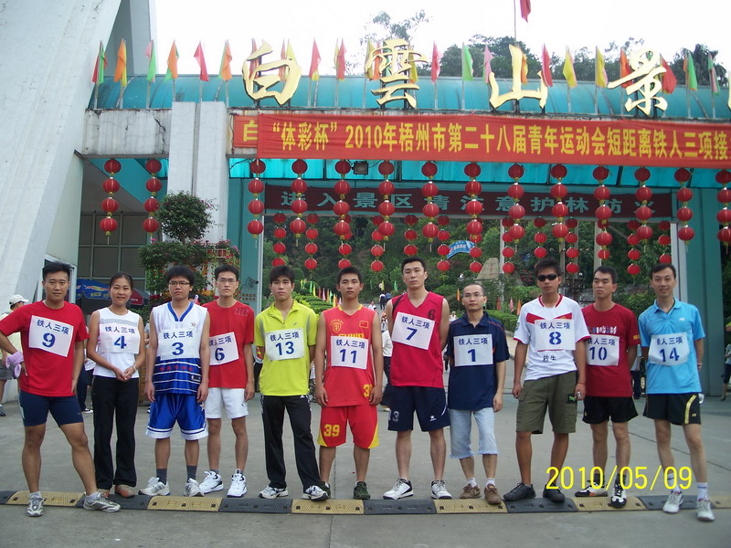 “鐵漢”齊亮相。短程鐵人三項接力各參賽隊第三棒在登白云山前合影,其中有一名女鐵人。 黃能 攝