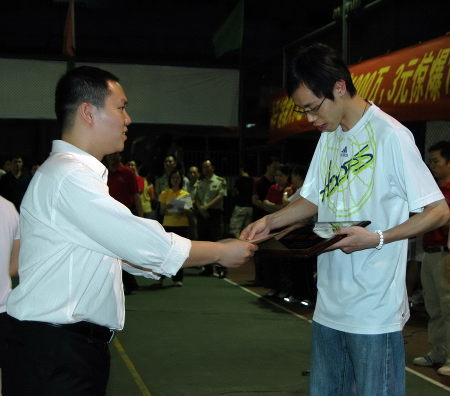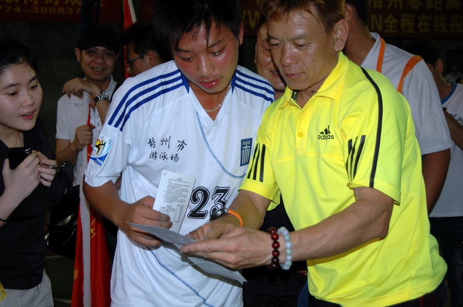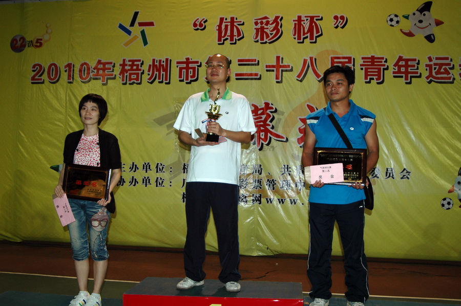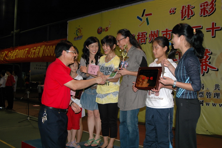 梧州體育彩票管理中心主任曾志堅向個項目冠軍隊伍贈送即開型體育彩票