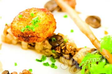 ????搭配理由:5年的巴薩米克醋像新酒一樣比較年輕,口感較酸,不能單獨使用,所以混合了橄欖油、新鮮松露和紅甜椒粉。山羊奶酪混合了蜂蜜裹面包屑煎炸,有濃郁的清新奶香,沙拉中還有腌制過的梨丁,所以用酸感多的醋來中和。