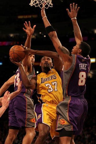 ????進入第三節,湖人高度優勢深入體現,拜納姆與加索爾連送封蓋,兩人更為湖人連拿前場籃板。雙方圍繞兩位數分差拉鋸至此節中段,科比快攻中輕松灌籃,阿泰搶斷納什后也反擊上籃,湖人67-51領先。