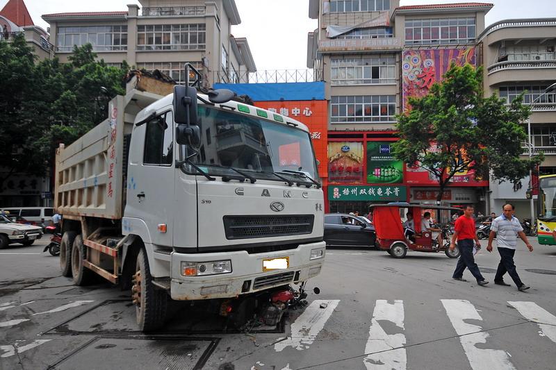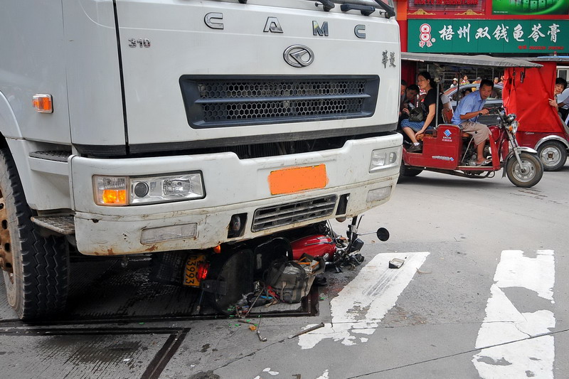 ?6月27日9時許,一輛大型卡車和一輛兩輪摩托車在白云酒店門前丁字路口處發(fā)生碰撞,摩托車隨即被壓在卡車前輪下,摩托車司機在事故中受傷。目前,事故原因還在進一步調(diào)查中。 何鎏/攝