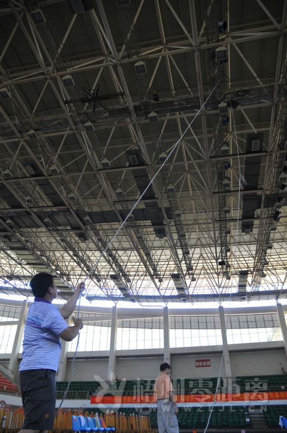 7月5日,工作人員在梧州學院體育館內吊裝頂棚的射燈。李鴻榮 攝