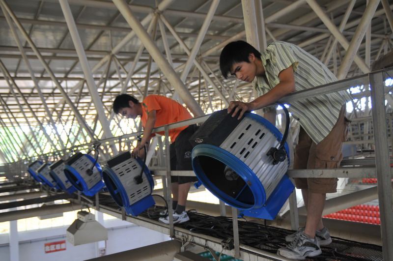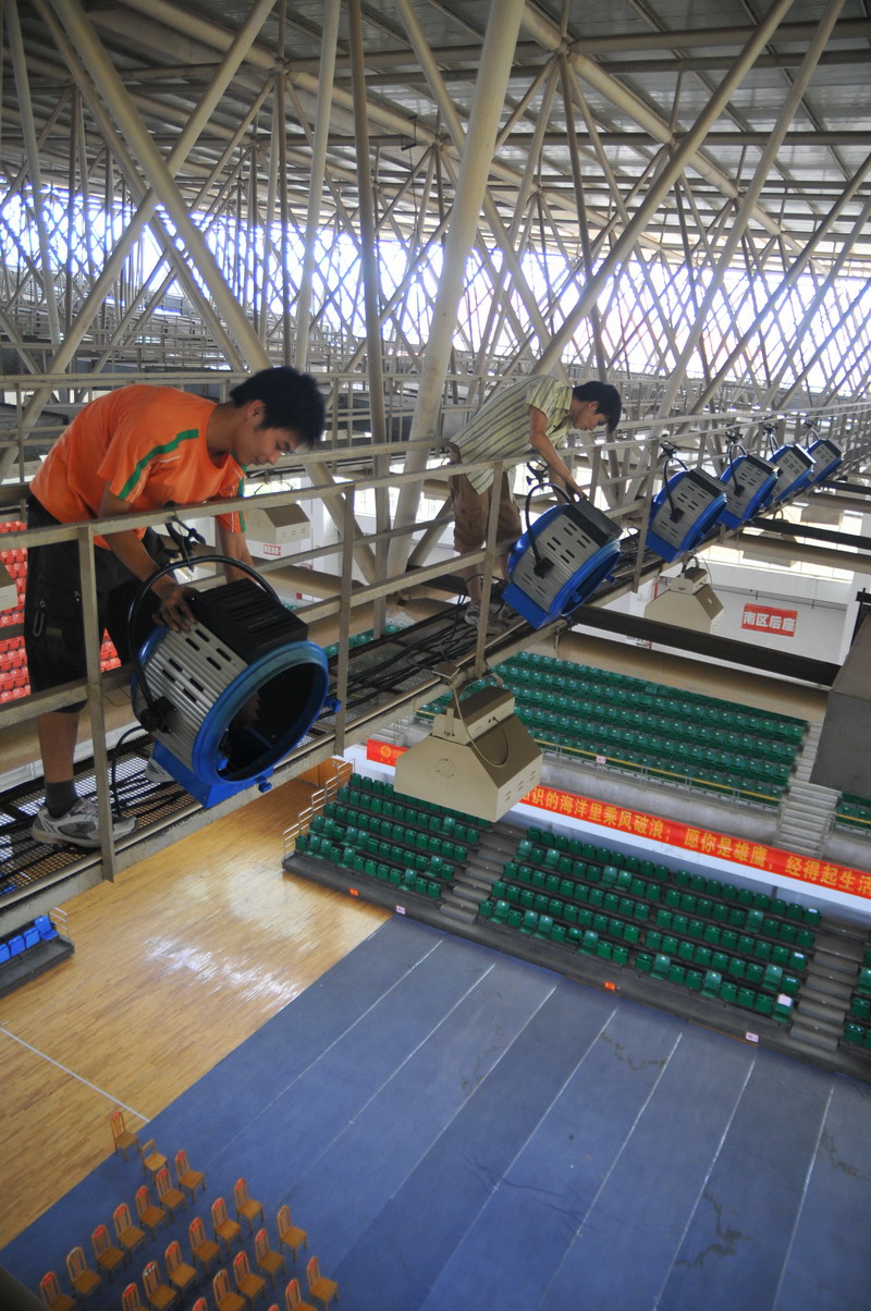 ??? 7月5日,工作人員正在梧州學院體育館的頂棚上安裝舞臺射燈。“愛心飛揚”——梧州市賑災文藝晚會將于7月8日晚在梧州學院體育館內舉行,目前晚會舞臺布置正在緊張進行。 李鴻榮/攝