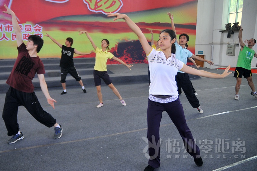 7月6日,市歌舞團(tuán)的演員們在梧州學(xué)院體育館內(nèi)排練歌舞節(jié)目,反復(fù)練習(xí)動作。李鴻榮 攝