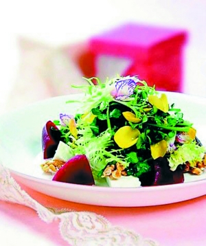 ????以蔬菜為原料的涼拌菜最適宜做雜豆粥的配菜,涼拌菜的取材也講究“雜”,可選番茄、黃瓜、西蘭花、胡蘿卜、紫甘藍(lán)、蘆筍、各種菌菇等,紅紅綠綠地拌在一起,加少量鹽和橄欖油,既賞心悅目,刺激食欲,又能從不同食物中攝取到全面的營(yíng)養(yǎng)。